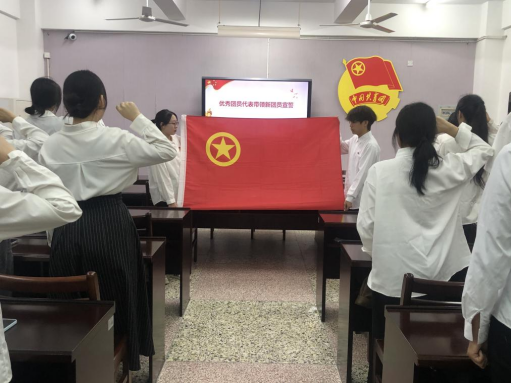 随着庄严的国歌声响起,入团仪式正式拉开帷幕。仪式中,主持人宣读了新发展团员名单,五位老师为新团员佩戴团徽、颁发团员证。接着新团员在团旗下庄严宣誓,他们紧握右拳,目光坚定,誓言铮铮。